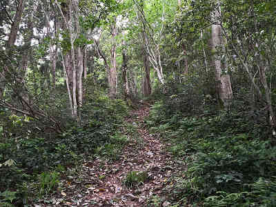 更に奥へ進むと550mの標高点手前でトカゲ岩を眺めることもできるようだが、フェリーの出港時間を考えるととても行けそうに無い。このポイントで下山を開始する。三角点まで引き返し、元来た道を引き返し、林道へ下り立った。そのまま林道を下り乳房杉を観賞し駐車地まで帰り着いた。