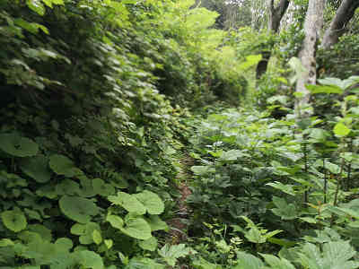 岩の目立つ道をわずかに進むと急傾斜の道に変わり、補助のロープを伝って慎重に下る。滑りやすく急峻な下りはしばらく続き、この方向からの登山を当初予定していたが、最後に苦労するパターンのようだ。左右に草の茂る道を一気に高度を下げる。やがて坂の傾斜が緩み一安心。