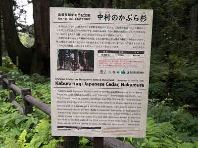 旅先なので安全第一、布施地区へ向かい隠岐国分寺への分岐を過ごし、銚子ダムへの案内に従い交差点を右折、しばらく進むと乳房杉への近道の銚子ダム横を通る道が現れるが通過、まずかぶら杉を見学する。新武良トンネルを潜った先でかぶら杉の案内を確認し、右の駐車場に車を置いてかぶら杉を観賞した。