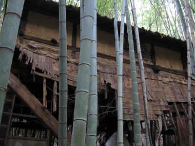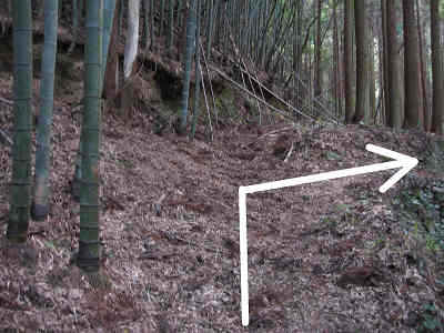 間もなく橋を渡り右側に向かうようになるが、橋の上から沢の下流を眺めると、ちょうど竹林と杉林が沢を挟んでにらみ合っている感じがした。その先で左手に廃屋を過ごし、暗い竹林帯を抜け、明るい登山道を進んでいると中電の巡視路の13番・14番の標識を見て道は左に折り返すようになる。