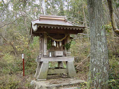 ロープを辿って階段を登りきると坂は緩やかになり、すぐに分岐と出会う。その分岐は白滝水神社への道なので参拝することにした。分岐に入るとすぐに結界が張られており、右手に鏡池、左手には白滝水神社が立っている。早速に神社に参拝して登山の無事をお願いする。この付近は白滝城跡の表示もあり、平らになっていることが分かった。