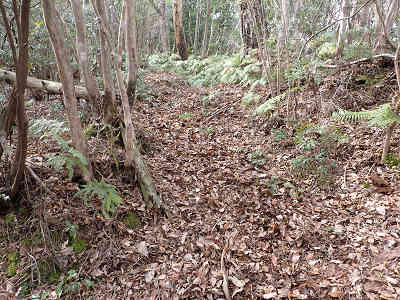 登山道は最初、わずかにシダがかぶる程度だが、登るに連れ次第に勢いを増してくる。ただし、昔からの参拝道なので、中央部がくぼんでおり、歩きやすい場所はすぐに見つけることができる。
