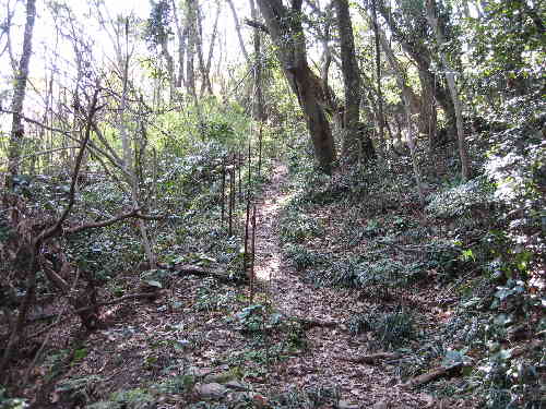 東ピークからの展望 一旦山頂を下り、竹藪の倒木帯の下を潜り、再び登り返すと東ピークに到着するが周囲は木々に囲まれて展望がない。大きな桜の木も立っているがまだ蕾のままである。東方向には「ひらの」と赤いペンキで書かれており、北方面にも下山口があるようだ。陶の道と書いてある、若山・法師山・四熊岳の標識を見て再び嶽山山頂に戻る。 嶽山山頂には犬を連れた方が休んでいたのでお話をお聞きする。この方はすぐ麓に住んで居られ、犬の散歩がてら嶽山にも登られているそうだ。この方が小学生の頃(50年位前)には、丁度竹が生えている場所から瓦を作るための土をケーブルカーで降ろしていたそうだ。また、東ピークから尾根を伝わって下りる道があり、この道はかなりの急斜面だということを聞く。 駐車場所を説明するとその場所に出ると言うことなので、帰りは一周回りに下りて行くことにした。嶽山山頂にて地元の方と別れて再び東ピークに向かう。東ピークから南方面に下りる道を確認するとペンキでやはり「ひらの」と書かれている。ひらのというのは富田西小学校のある富田地区の南に位置する平野地区のことを指しているのかも知れない。