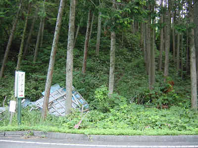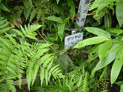 2005年 8月7日(日曜日)のダツヤ山奮戦記を見る 2005年8月14日(日曜日) ダツヤ山 登山口 林道豊田鹿野線登山口 ガイド本 金光康資著 防長山野へのいざない 登山開始 7:18 山頂到着 9:22 下山開始 9:40 下山終了 11:20 登山時間 2:04 山頂滞在時間 0:18 下山時間 1:40 所要時間数 4:02 本日は旧旭村のダツヤ山を目指し、柳井を5時過ぎに出発した。国道2号を進み、新南陽の永源山公園を右折して国道489号・376号を経由して徳地町から山口市の仁保に抜け、県庁手前から21世紀の森方面に向かい、21世紀の森を通り過ぎ、坂を一旦降りて行くと左側に夏木原キャンプ場を見る。 キャンプ場先の左の分岐に入り、林道豊田鹿野線を進み、小吹峠を過ぎて下って行くと右手に「ダツヤ山標高746m」の標識が立っている。本日は標識手前50m付近の駐車スペースに車を置き、登山を開始する。林道を降りて行き、すぐにダツヤ山の標識を見て、倒壊した小屋を踏みしめ登山道に入る。すぐ左右に笹のお出迎えで山口県100名山の99番目の山を踏みしめる。
