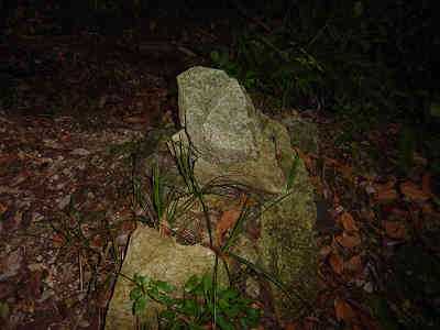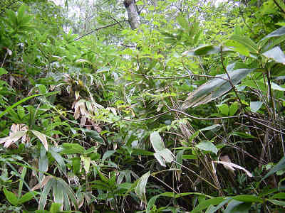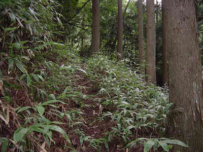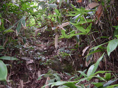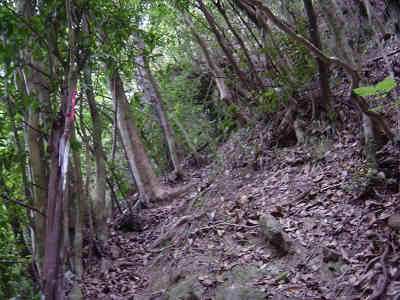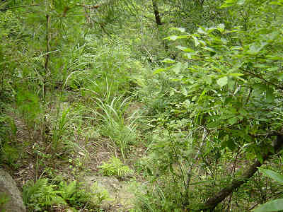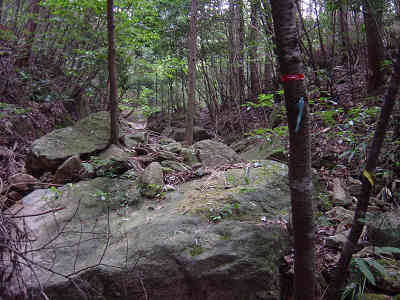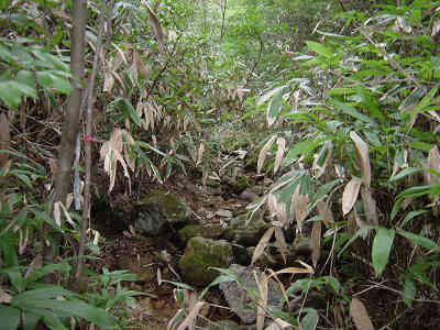 沢と別れ、一旦上に向かって進んでいると前回マムシに出会った場所に出る。ここから沢と平行に進む目印を探すとすぐにテープが見つかった。これで今回の登山は成功したも同然と安心する。前回の失敗はマムシに気を取られてどんどん上に向かって登って行ったことが原因であることが判明した。