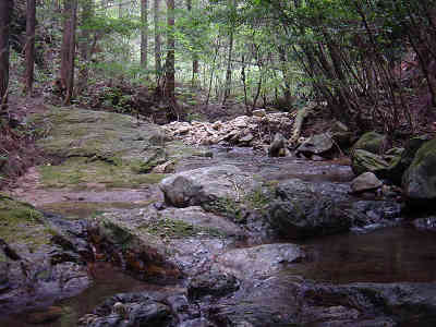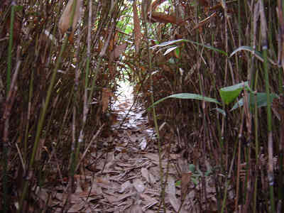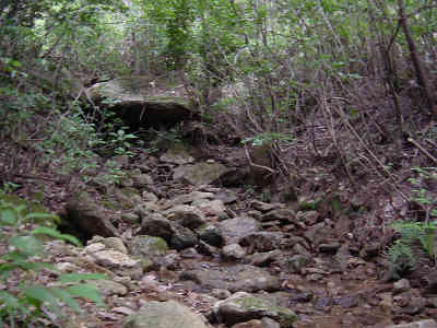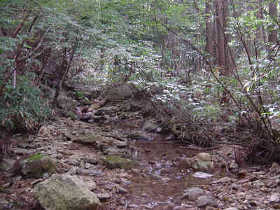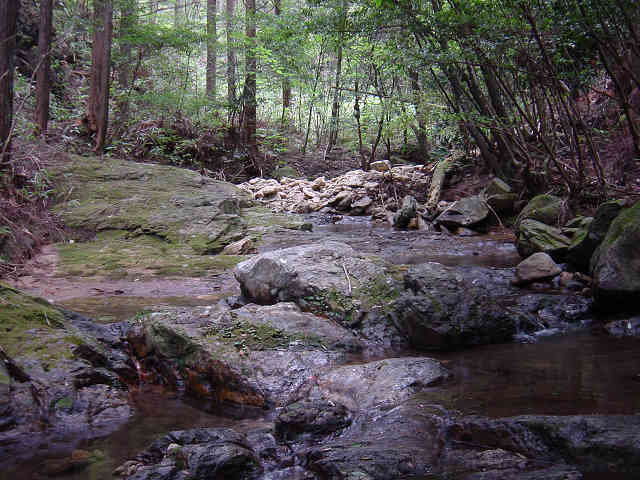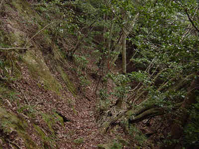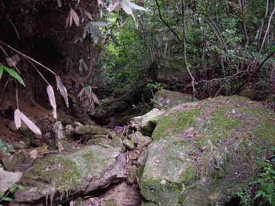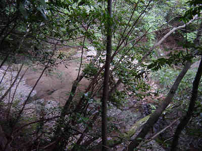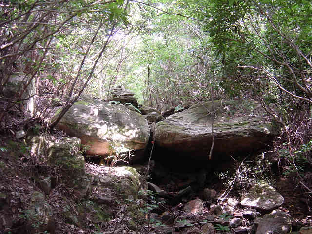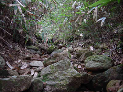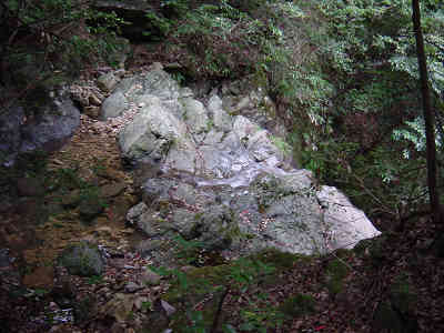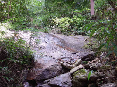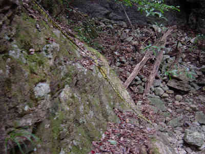 左の細い岩道を進んで行くとロープが渡してある。先週1回目に道を違えたときの原因がこのロープを登ったことなので今回はロープを降りて正しい道を進む。すぐ正面には再びロープが渡してあり、ロープを伝って登って行くと登山道が続いている。この先沢に沿って進んで行く。