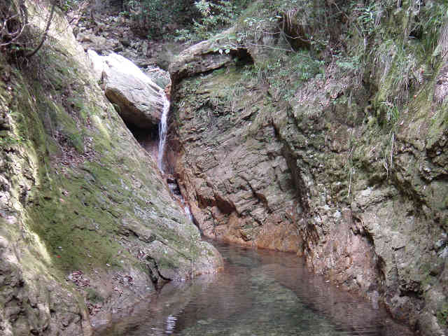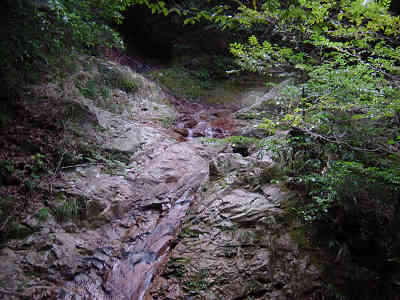 すぐに前回未練を感じながら別れた最後の滝を見て斜面に取り付く。ここまで登山開始から20分の行程である。ここから前回はひたすら上を目指し進んで行ったのが2回目の間違いだった。先週から一週間、たっぷりとこの付近の地形図を頭に入れ、ガイド本を何回も読み返した結果、「沢を右下に見ながら、沢を見失わないように進んで行くことがポイント」と言うことが分かった。