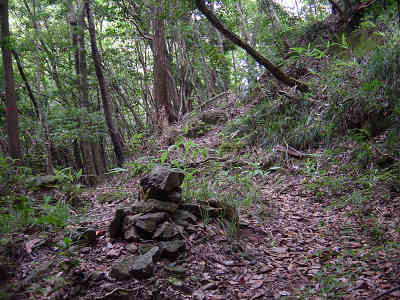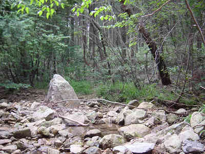 涼しい沢の中をテープに従って歩いていると「ダツヤ山へあと50分」の標識が現れた。ここまで登山開始から丁度1時間、今日は絶対に道を間違えないと慎重に目印を探しながらの登山なので、極端に遅いペースで歩いている。標識を過ぎると檜林帯を少し進むが、すぐに沢の中を歩き始める。沢を進むとケルンを戴いた大岩を超える。沢を詰めてゆくと笹が被りだし、足下のゴロ石に足を取られながらの登山が始まった。