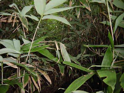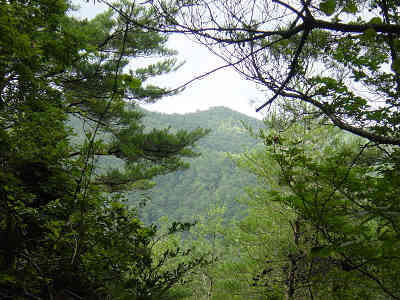沢と笹とに気をつけながら進んで行くと残り50分標識から20分で一旦沢から離れて右側の斜面に取り付き、笹の中を進む。急斜面の笹道は初めての体験でなかなか体が前に進まない。ザワザワと背丈以上の笹を掻き分けながら笹の斜面を登って行くと沢から別れて10分で木の間越しに、目の前の山を垣間見ることができた。更に3分我慢して笹を漕ぐと見晴らしの良い展望地に出て、やはり木の間越しにはなるが東西鳳翩山を展望することが出来た。