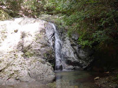 5分で最初の堰堤を右に見て檜の植林帯を進んで行くと4分で2番目の堰堤を右に見る。右手には水のない川を見ながら進むと登山開始から13分で綺麗な滝を見る。沢にはハヤが泳いでおり、豊北町の白滝と見間違えるような綺麗な景色が待っていた。