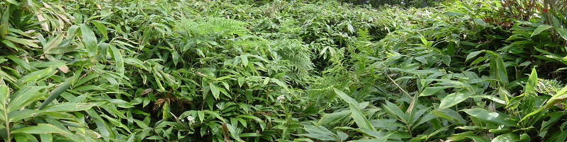 この先展望は期待できそうにないので東西鳳翩山を鑑賞しながら少し休憩をする。この先尚も笹藪の急坂を進む。残りの標高差200m、残り150mと山頂へのカウントダウンをしながら笹藪を掻き分けて行く。先週の龍門岳とは比べものにならないような長く厳しい笹の坂道を、頭を下げながら進んで行く。