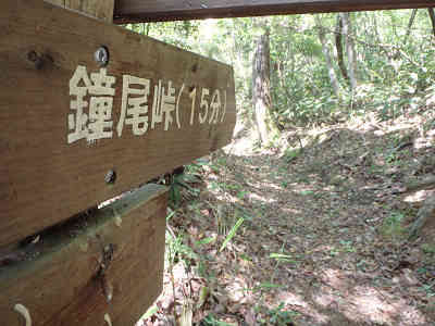 広い山頂にて記念撮影の後、最高地点まで100mの案内に従い進路を西へ採れば、鐘つき堂の案内の置かれた平坦な場所へ着いた。西の樹間越しに月山山頂などを眺めた後、三角点峰まで引き返した。眼下に広がる展望を眺めた後、鐘尾峠へ向かって下山を開始する。すぐにロープの渡された坂を下り、鐘尾峠から高盛山へ続く縦走路へ着く。