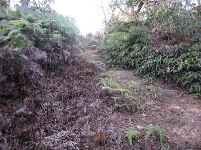 足下に石杭を過ごす辺りから周囲が少し開けてくる。左右にシダの目立つ急な坂を少し踏ん張ると地積図根三角点の立つ明るい展望地に到着した。登山開始からはゆっくり歩きの15分の行程である。
