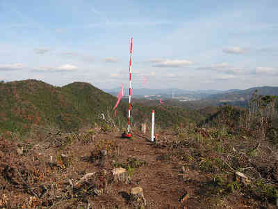 この展望地からは東方面が開けており、美祢の市街やその右手に桜山、更にその右手に先程登った鳥の子山がとても近く見えており、少し登っただけで素晴らしい展望が広がっている。足下には地籍調査の杭が続いており、このまま東方面に下りることも出来そうだ。