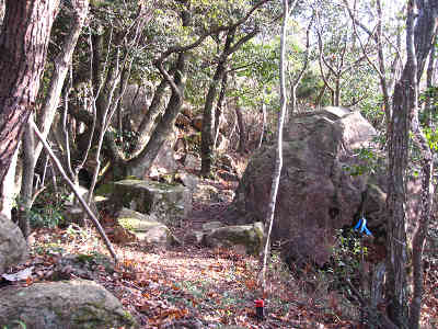 この先登山道は少し平坦な道になり、大きな岩が並んだ場所を通り過ぎる。この岩を振り返るとなんと石碑のような美しい並び方をしていた。最近はこのような自然の織りなす芸術に感激することが多すぎる。