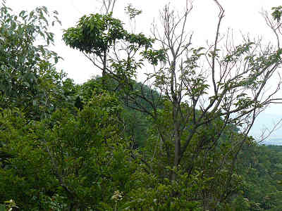 西の展望地の展望 西の空にかかる雲はまだ薄く、雨が降るにはもう少し時間がありそうだ。展望を眺めた後、来巻西下山口の標識に従い下山を始める。標識には「植林作業道 荒地」と書かれている。自然林の下に付けられた細い道を下る。踏み跡は確かなので迷うことはない。しばらく西へ向かって下りて行き、カマボコ板のような木切れに来巻西と書かれた場所で北へ進路を採り、坂を下る。坂道は右方向に続き、急な斜面なので滑らないよう注意が必要だ。