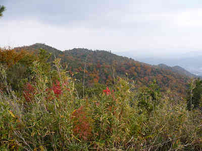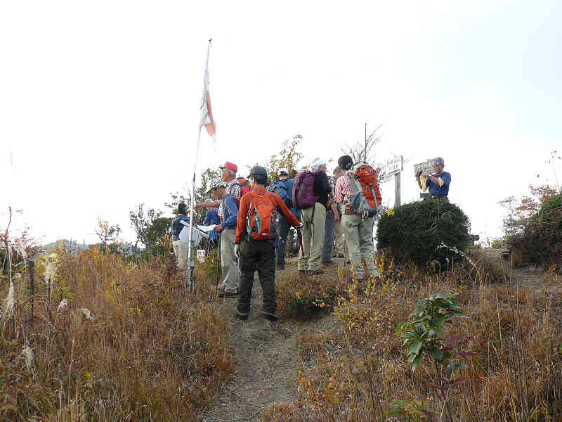 尾根に着けばもう快適な縦走路が始まる。周囲に美しい紅葉を眺め、緩やかなアップダウンを繰り返せば、間もなく展望の虎ヶ岳山頂に到着。山頂では約30分の休憩、その間にリンゴやおもち、お菓子、コーヒーなどのお接待があり、思い思いの場所にて大休止を取る。