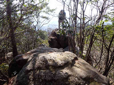 南に展望が広がっていたが、少し霞み気味なのではっきり眺めることはできなかった。しばらく岩尾根の急登が続くが、この岩尾根は岩好きにはたまらないだろう。休み休み高度を上げる。