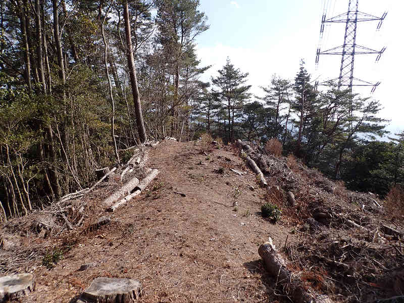 やがて鉄塔巡視路に出合い、そのまま巡視路を下ると、柳井火力連絡線61鉄塔に着いた。明るい巡視路の下で小休止を取り、樹間越しに物見ヶ岳を眺めて巡視路へ戻る。伐採地をいくつか過ごすとNo.60鉄塔の下に着く。