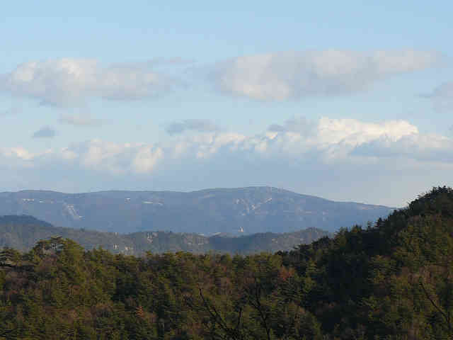 発喜山の野間神社と神社裏の大岩 神社からは木の間越しに北方面の展望を眺める。正面に見えているアンテナ山は呉裟々山であり、その下の山はいずれ登る予定の日浦山である。この方角の山については少し山名が分かり始めている。野間神社を出発、美しい小田山を眺めて更に下山を続ける。
