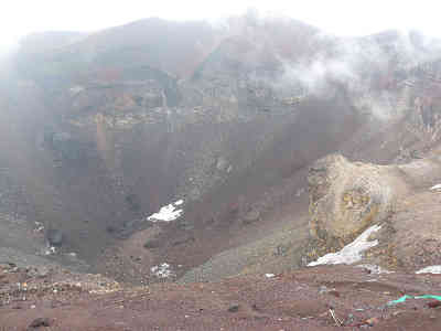 お鉢の中には万年雪が残っており、とても感激する風景である。日本最高峰の剣ヶ峰まで200mの案内を過ごせば、急な斜面が待っている。足下がずるずる滑るが、今日は湿気があるので少しは足の踏ん張りが効く。左側に配置してある手摺りに頼ることなく高度を上げ、富士山特別地域気象観測所の建物へ到着、右には日本最高峰富士山剣ヶ峰の石柱が立っている。