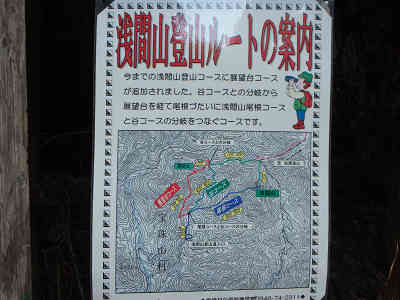案内を確認し、大岩の手前の分岐を右折して浅間山尾根コースへ向かう。目印のテープを確認しながら尾根道を辿れば一気に高度は上がる。急登なので手当たり次第に目の前の木をつかみ、体勢を整えながら歩を進める。周囲は樹林に覆われ、展望はないけれど、自然林なのでとても明るい。