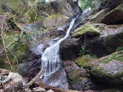 登山口を出発、右に沢を見ながらわずかに進むと前方に滝が見えてきた。案内には、「谷を渡り右上に高巻いて、滝の上部に出る。そして左に渡り、先でまた右へ!」と書かれている。まさに的確な案内である。まずは滝見学、少し進むと細い滝を眺めることができた。 滝見学の後、少し戻り、沢を渡ってロープを補助に斜め上へ移動する。植林帯の下で折り返すように左折、山腹につけられた細い道を辿り、急な坂を下って滝上に立つ。ここで沢を渡って右へ進路を採り、少し進んで再び沢を渡る。このあたりは変化が多く、とても楽しい登山道である。