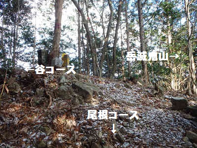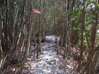 山頂から急な坂を下っていると、昨日来の寒波の名残で、足下には雪が残っている。滑りやすいのでスリップしないよう慎重に坂を下る。ありがたいことに、ここには補助のロープが渡してあるのでとても助かる。鞍部に下り立ち、露岩の美しい場所を通過。岳滅鬼山へ続く縦走路を見上げれば、その高さにまだまだ高度を上げなければならないことを痛感する。ここで東に展望が開けるも、逆光気味なので少し見づらい。植林帯の下につけられた道を辿って高度を上げれば、谷コースから続く登山道に合流した。