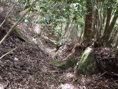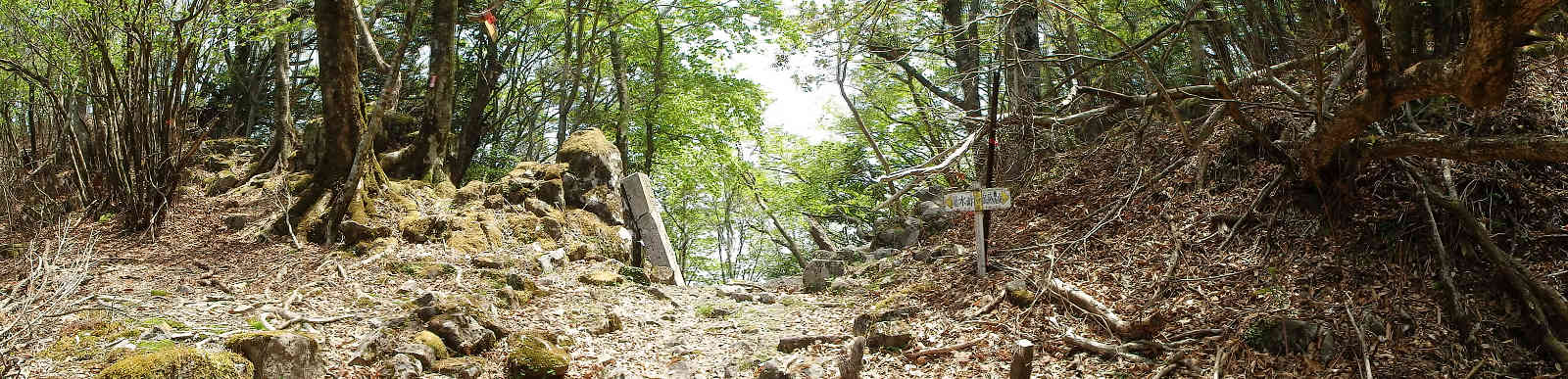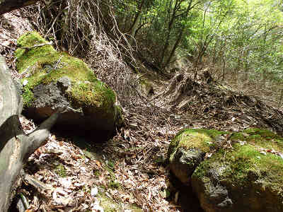 舗装道を道なりに進むと、道の横にも岳滅鬼山の案内が立ち、左に北山神社を過ごせば、「林道中山幹線(起点)」の案内を見つける。林道に入り安心していたら、この林道には落石が多く、タイヤがパンクしないよう石を撤去しながら進むことになる。それでも何とか終点近くまで行き、車の方向転換をして登山を開始する。なお、登山口は林道終点から少し手前に引き返した山側にある。 岳滅鬼山の案内に従い山道に入り、中央部の掘られた道を辿ると、間もなく進路は右方向へ変わる。左右に苔むした岩を眺めながら進み、左側に石垣を過ごせば、突然と言った感じで前方に素掘りのトンネルが現れる。このトンネル上部には法華窟と刻まれた石板が残っていた。 「大分県の山(山と渓谷社)」の案内によれば、修験道の盛んなころ、法華窟とよばれる聖地があった場所と伝えられている。さて、広い素掘りのトンネルを抜け、足下に岩の多い道を辿る。目印のテープに従い、途中からジグザグを描きながら高度を上げると、明るい岳滅鬼峠へ着く。 ここには「従是北豊前國小倉領」とはっきり刻まれた境界石が残っている。同様の石は立っているもの、横たわっているものなど3種類を見つけることができた。さて、ここで福岡県側のシャクナゲ山莊からの登山道と合流し、西へ向けて山頂を目指す。