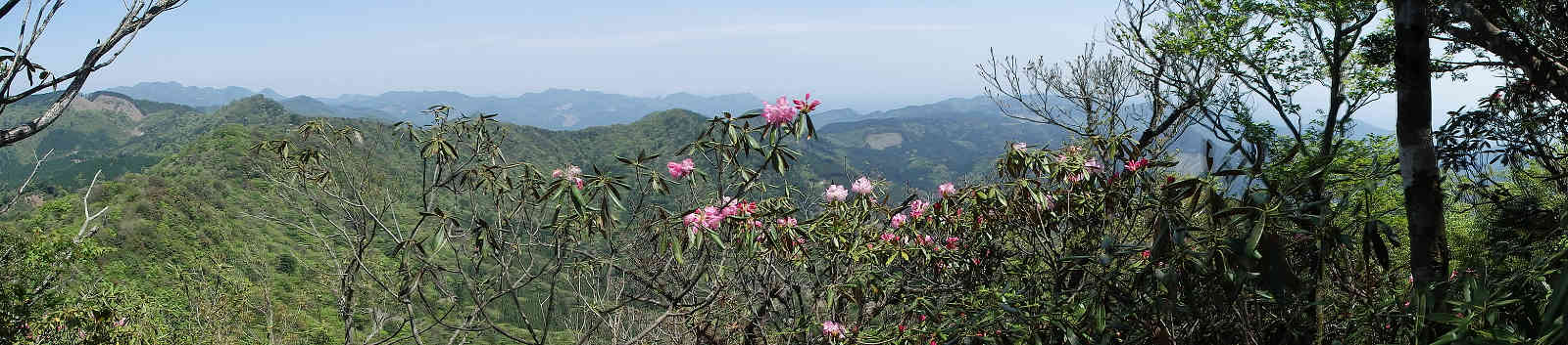 国境石を過ごし、岩の目立つ道に入る。自然林の間につけられた緩やかな傾斜の道を辿れば、周囲には三つ葉ツツジが咲き始めている。途中にそびえ立つような露岩の前で、岩を下りるご夫婦を待ちながら周囲の展望を眺める。ここで、このご夫婦とお話をしてみると、山口県の周南市より来られた方で、私のHPを見たことがあるとのことで恐縮。この方は、すでに千以上の山に登られている大先輩であった。 ここではつぼみのシャクナゲを観賞、ロープの補助により岩を越え、岩上に出れば向かいに英彦山が間近に見えている。更に北から東へ続く展望を眺めて岳滅鬼山へ向かう。展望地の先にはシャクナゲが咲いており、この鑑賞も楽しい。 展望地を出発し、シャクナゲを眺めながら峰入り古道を進むと、ロープの渡された急登となり、ロープを補助に急な岩場を乗り越えると、東にはシャクナゲ越しに美しい展望が広がる。岳滅鬼峠から600m進んだ地点が山頂手前のピークで、手製の案内には1037mと書かれていた。