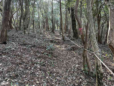 山条山の山頂を出発し、最後のピークへ向かいます。進路は北東に変わり、小ピークを踏みながら進むと、山頂手前から右へ登山道が分岐していました。この道は西畑登山口へ続く周回道と思われますが、今回はピストンなのでこの道は通りません。