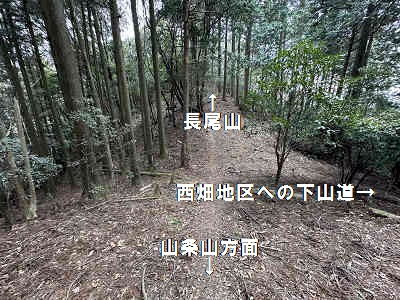 さて、そのまま元来た道を引き返しても良いのですが、長尾山からミツマタの咲く場所までが未踏破なので、前回同様東山、山上山、長尾山へ周回します。山頂を出発し、西畑コースへの分岐を右に過ごし一旦上田代コースに入ります。
