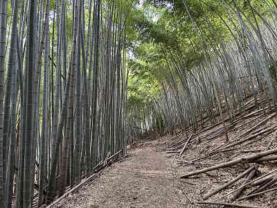 ミツマタの群生を鑑賞しながら進んでいると、右側に鉄製の門が見えてきました。この場所が今回の周回登山の下山地点と思われます。そのまま作業道を進んでいると道の左右にススキが目立ち、この付近から登山道に入ります。