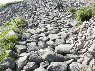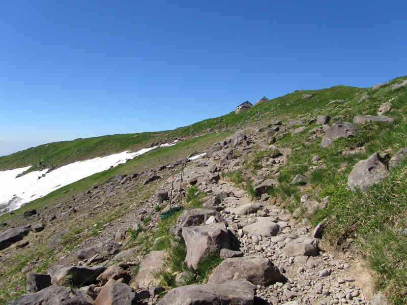 草原の先にそびえる山脈は、少しずつ低くなり、このピークの山腹には多くの登山者を見つけることができる。これから向かう登山道は緑の草原の中に刻まれた一本のラインのようにも見えている。高度を上げて行くと、眼下には雪渓が目立ち始め、草原の中に浮かぶ白い色はとても鮮やかである。足下に続く岩道はまだまだ続き、前方に岩の多い場所を過ごす。整然と並ぶ岩が現れれば、この場所はたたみ岩と言われる名所で、びっしりと岩が敷き詰められている。