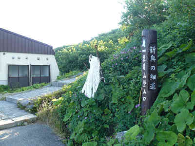 登山準備の後、すぐに八合目を出発。登山口の先から道は左右に分岐しており、左手に向かえば月山御田原参篭所や御田原神社を経由して月山へ向かい、右道を採れば無量の池を経由してやはり山頂へ向かう。ここでは、帰りにのんびりと月山御田原参篭所や御田原神社を散策するため、無量の池を経由する右道を採る。