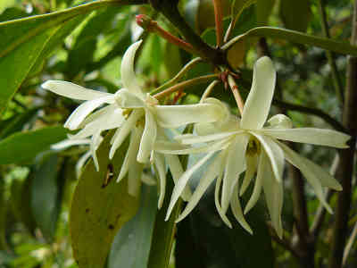白い花を観賞する この付近からほとんど平坦な道を進む事になり、快適な遊歩道歩きを満喫する。右手に大きな岩を過ごしながら進むと、遊歩道は突然右に向き、山頂までは残り800mとなる。