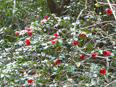 真っ赤な椿の花を観賞すると間もなく山頂まで500m標識を通過、中宮への分岐を左に見送る。なお、中宮までは600mの行程だが、前回参拝しているので今回はそのまま山頂を目指す事にした。