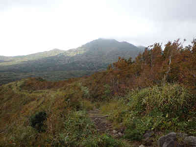 擬宝珠山を振り返ると山頂部はやはり雲の中だった。眼下に鏡ヶ成の草原を眺めながら象山へ向かう。南に見えている山は三平山だろうか、とてもきれいな山容である。間もなく象山へ250mの案内を過ごし、この先で山腹を折り返しながら高度を上げる。