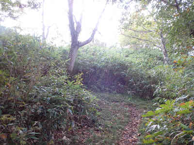 左右に笹原を眺めながら坂を下り、象山と鏡ヶ成の分岐点へ着いた。ここで雲の中の象山へ向かうか、次の山へ向かうかを考えたが、象山へ向かっても往復30分程度の行程なので、そのまま向かうことにした。整備された石段へ向かい、少しずつ高度を上げる。