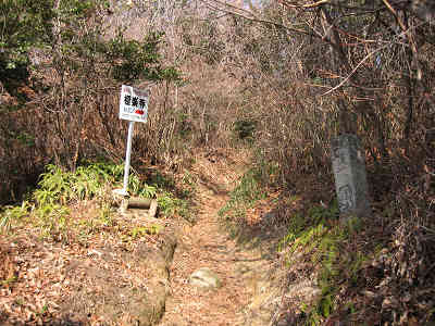 さて、いかにも里山という感じの道をゆっくり進んで行くと、10分で右手から合流する道を見る。標識によると、「この道は極楽寺山登山道の旧道で、六丁・五丁・四丁の石標柱があり、出口はバイパスの側道、右折して2号トンネルへ」と書いてある。今日はバイクを下山口に配置しておらず、帰りもこの道を取る場合には旧道を歩いてみることにする。