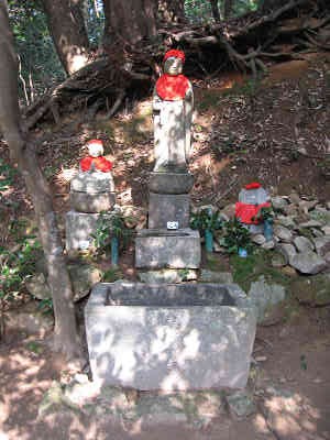 阿弥陀堂を出て手前の地蔵菩薩にお参りし、東屋にて昼食を取る事にした。東屋に行くと、極楽寺橋先の展望地にてお会いした年輩の方が登ってきていたので少しお話をする。お年を聞くと82歳、お元気なものである。 さて、東屋では陽差しはあるのだが、少し風もあるためじっとしていると寒くなる。暖かいカップヌードルで体を温め、食後のコーヒーを・・・・と無い!、コーヒーが無い。登山準備の際に車の中に落としたようだ。仕方がないのでお湯を飲む、うーん暖かいので水よりはましな程度かな。
