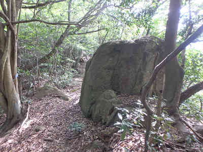 神籠石をしばらく眺めた後、登山を続ける。中門を過ごした先の分岐は、左が御所ヶ岳へ向かう近道、右は景行神社や奥の院を経由するコースである。ここでは景行神社を経由するコースをとる。