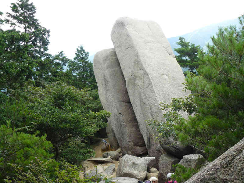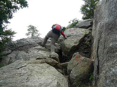 そのまま左側の岩壁沿いに進む。背後に見える岩場はとても壮観である。右に展望地を過ごし、左右に笹の茂る登山道を進む。いかにも滑りやすそうな岩場に着き、補助のロープを伝って左側から坂を登る。ここにはとても滑りやすい岩があり、特に慎重に岩を越える。