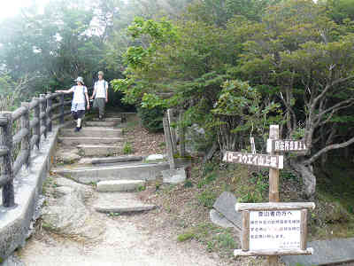 岩上に着けばもう大した障害はない。そのまま岩道を進むと階段があり、この階段を登れば、山頂部の端に位置する富士見岩に着く。但し、周囲には雲が多く、展望を得ることはできなかった。理論上はこの岩上から富士山が見えるのかも知れない。ここで御在所岳頂上とロープウエイ山上駅の分岐に着き、にぎやかなロープウエイ方面へ向かうことにした。