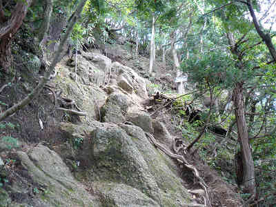 やがてえびす岩と案内のある場所に着くが、いったいえびす岩がどれなのか分からない。木の間越しに岩の多い場所が見えているので。この大岩群のことかも知れない。ここで、初心者にとって一番の難所が現れる。斜めの斜面にロープが2本渡されているのだが、いったいどこに足を置けばよいものやら。
