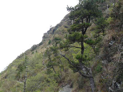 少し坂を折り返すようになり、岩肌を観察してみると断層のような岩であることが分かった。眼下には切れ落ちた孟祿(モンロー)断崖が広がっており、滑り落ちれば一溜まりもない。足下に名残の馬酔木の花を過ごせば、周囲は日本庭園のような松が広がる。