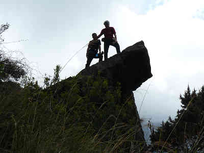 岩壁の横を抜け、いかにも落石の起きそうな場所を通過すれば残りは2.5km、前の標識からは18分の行程である。周囲には霧が発生し、視界が狭くなってきた。木の根の張る道を慎重に進めば13分で次の500m標識に到着、残りはもう2kmだ。更に9分で標高3173mの大峭壁に到着。大きな岩壁を見上げながら小休止を取る。