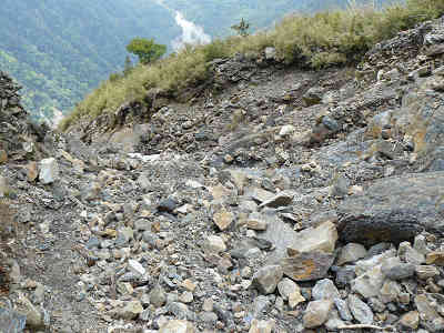 ほとんど平坦な道を進めば500m標識、残りは4kmようやく中間点を越えた。前の標識からは15分の行程である。足下には小石が点在し、シャクナゲも見ることが出来る。もう少し進めばガレ場を通過、浮石に気をつけながら通過する。上を見ても下を見ても岩・岩・岩、もし岩が落ちてくれば大変なことになる場所である。この付近では沢山の下山者とすれ違う。
