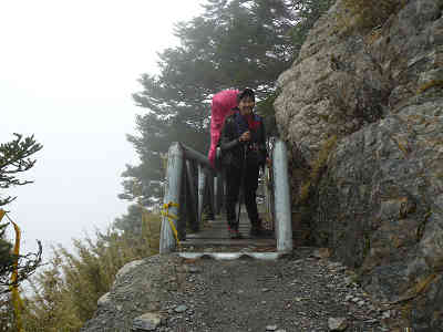 左手に無造作に伐採された大木を過ごし、70番の橋を過ごせば残りは500m、いよいよ排雲山荘は間近だ。前の標識からは19分の行程である。霧の中を少しずつ高度を上げて行き、岩壁に渡された橋を渡ればもう残りは僅か。