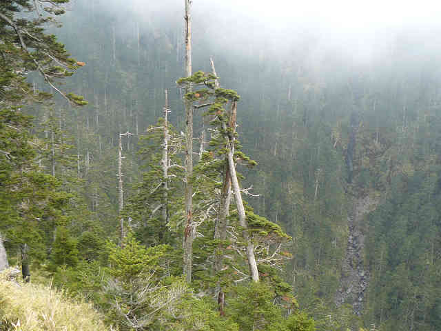 向かいの山には雲がかかり、眼下には楠梓仙渓が広がる。施さんは遠くに滝もあるというのだが、これはよく見えなかった。前方に形の良い木を眺めながら進んでいると、白い花のようなものが目立ってきた。これは霧から水分を取って成長している植物である。沖縄で見たものと色は違うが、生命力の強い植物のようだ。
